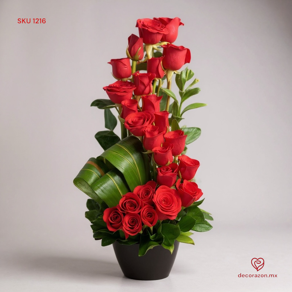 Arreglo estilizado en base. Acompañado de follajes finos.