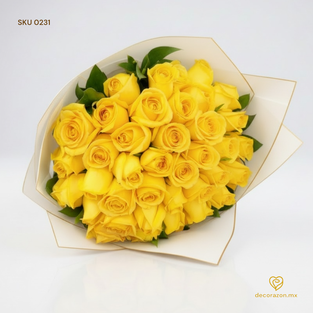 Imponente ramo en Rosas Amarillas que no pasará desapercibido, el color de las rosas es ideal para expresar total admiración, también el color amarillo es ideal para dar animo y desear un "Mejórate pronto".