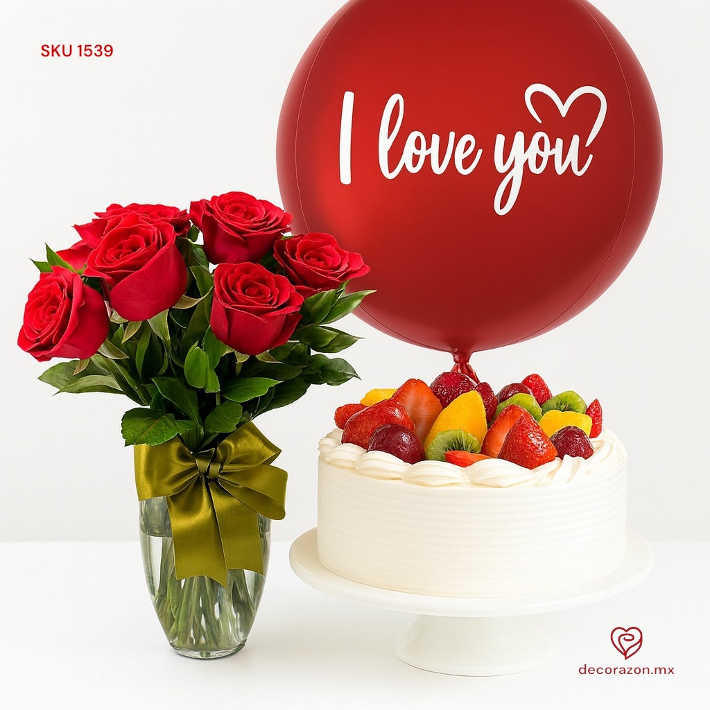 Este combo incluye un hermoso globo, flores y un delicioso pastel. Sorprende a tu ser querido con este regalo completo y demuéstrale tu amor en su día especial. ¡Haz su corazón latir más fuerte con esta perfecta combinación de amor y dulzura!
