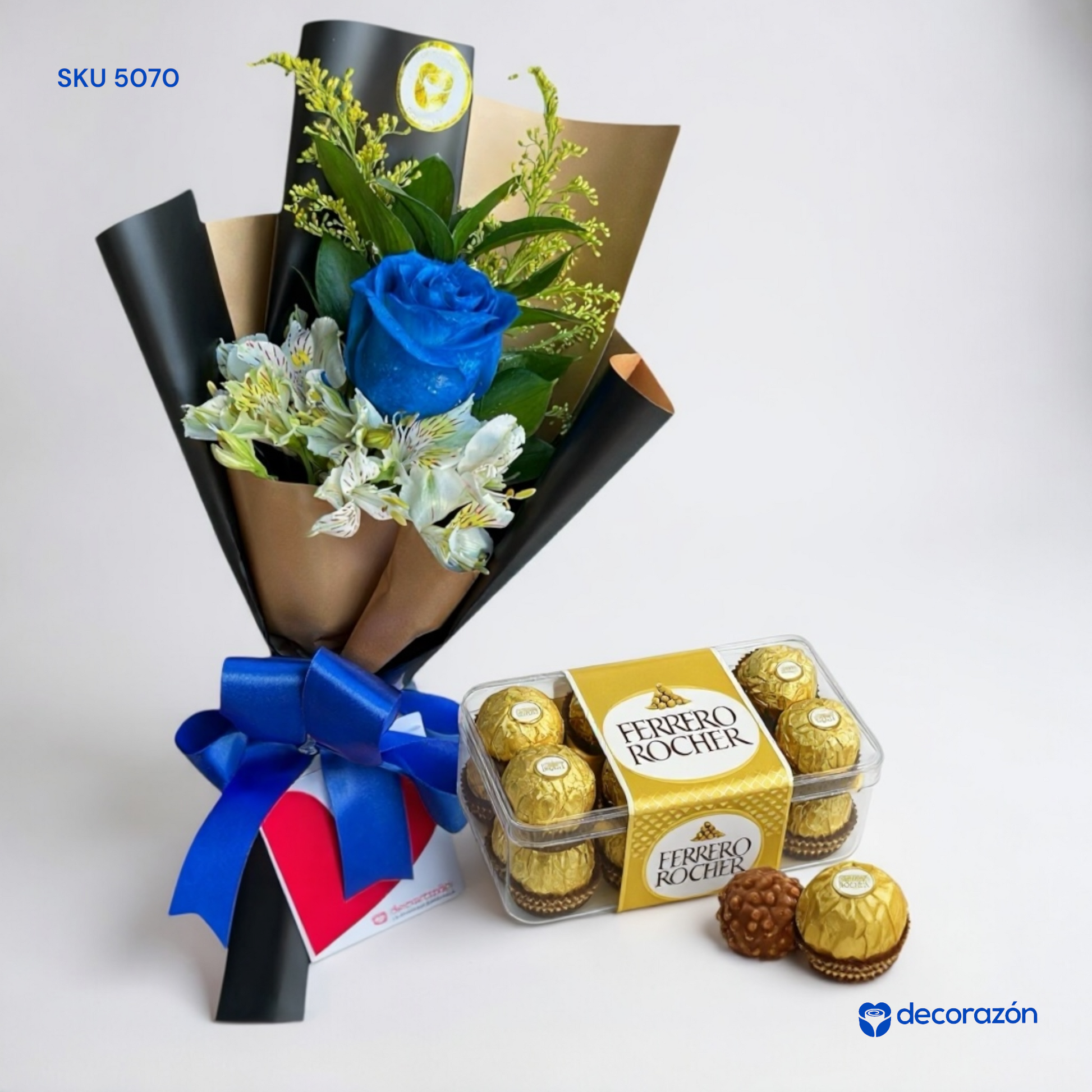 Sorprende con nuestro hermoso ramo de rosa azul y deliciosos chocolates Ferrero. La elegancia y el sabor se unen en este regalo perfecto para él. ¡Una sorpresa que seguro lo dejará sin palabras!