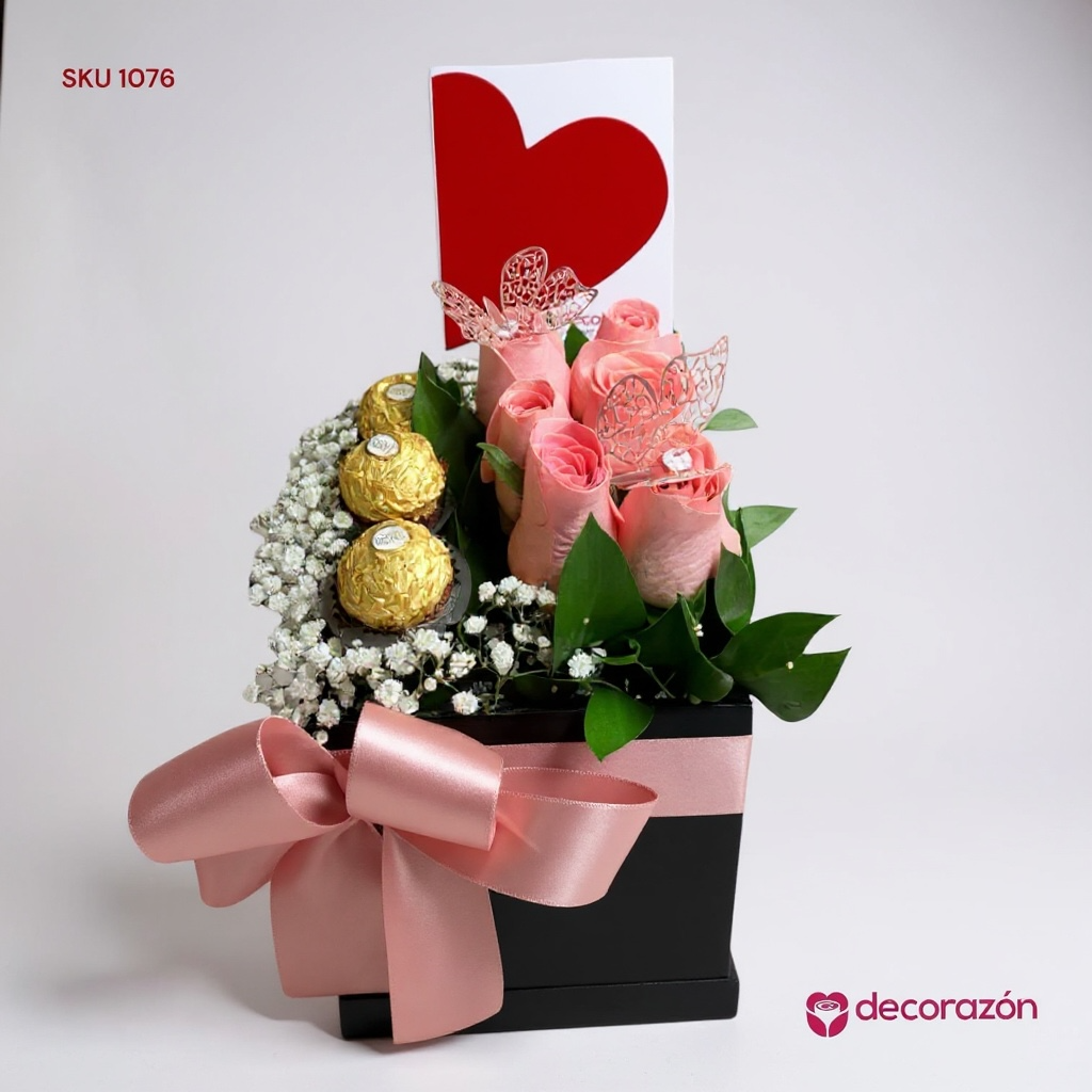 Caja en tonos rosa con un toque de chocolates Ferrero, sorprende a esa persona especial haz que tenga un bonito día.