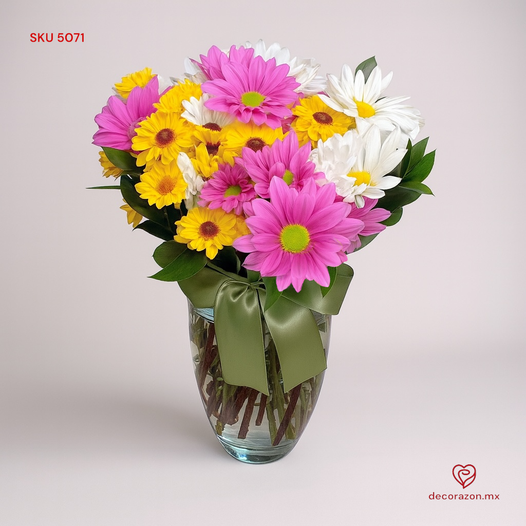 Este encantador florero de margaritas de colores, llamado Calidez, es la adición perfecta a cualquier hogar. Con su vibrante y alegre esquema de color, las margaritas iluminarán cualquier habitación. Con un toque de felicidad y calidez sorprenderás a esa persona especial.