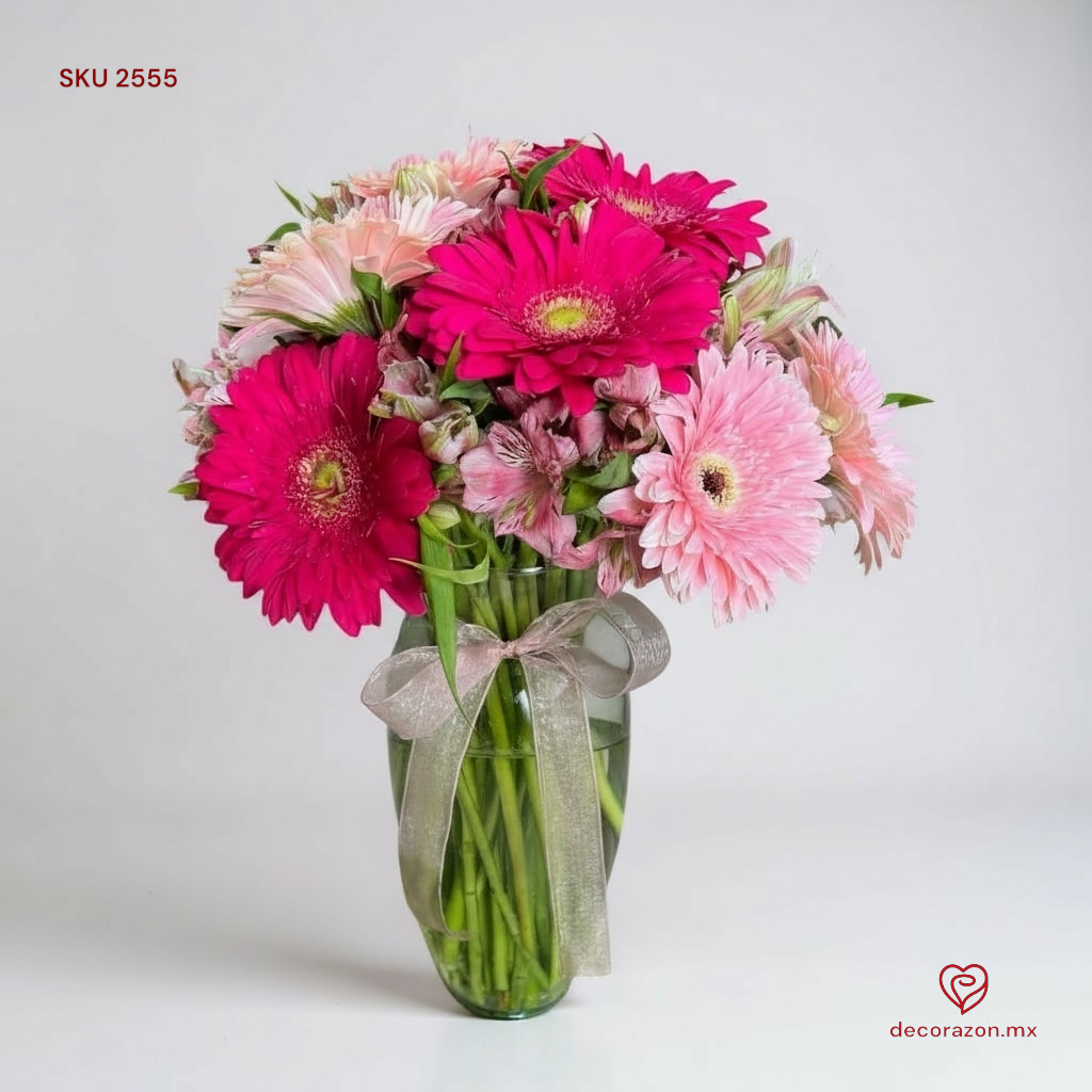 Un florero clásico con la combinación de Gerberas en tonos Rosados y abundantes Astromelias.