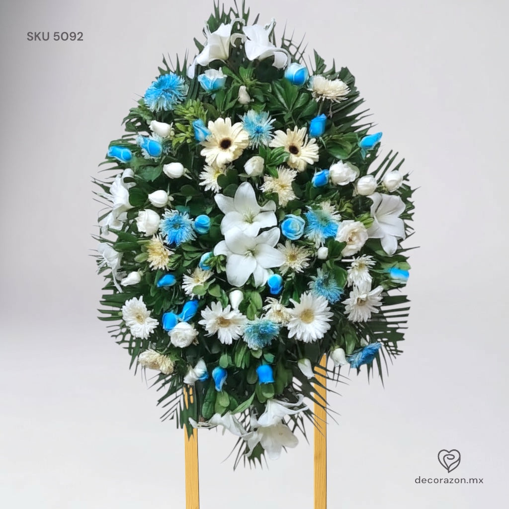 Esta corona es perfecta para honrar y recordar a un ser querido.Con tonos blanco y azul, transmite paz y serenidad. Además, su diseño elegante y sobrio la convierte en una opción respetuosa y adecuada para estos momentos difíciles.