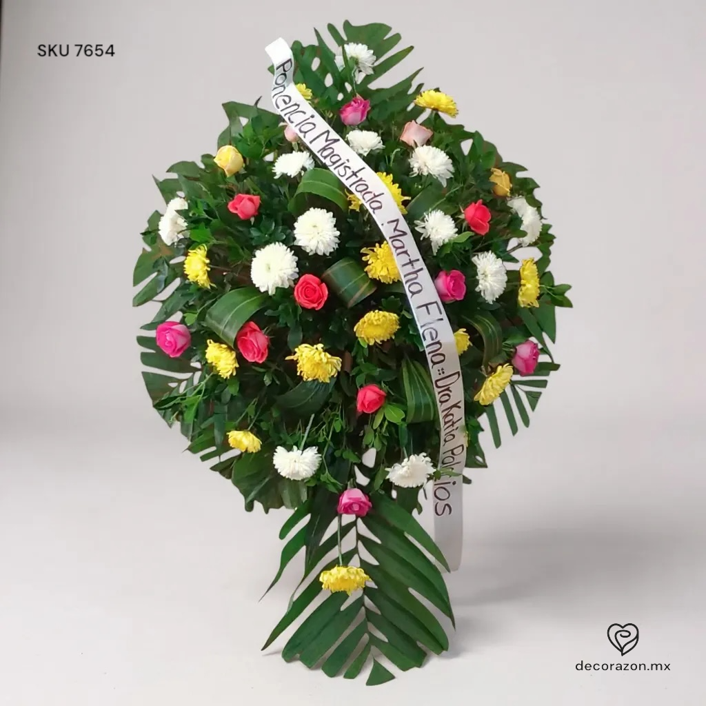 Esta corona es una opción respetuosa y elegante para honrar y recordar a tu ser querido. Con flores blancas fiucha y amarillo. Rinde tributo a la vida de tu ser amado con esta hermosa ofrenda.