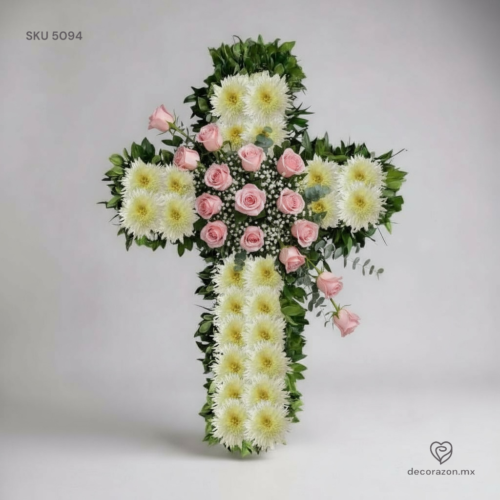 La Cruz Inmaculada presenta un diseño delicado con tonos de rosa y blanco, ideal para expresar condolencias y simpatía. Su elegante apariencia transmite consuelo y paz en momentos difíciles. Expresa tu apoyo con esta hermosa cruz.