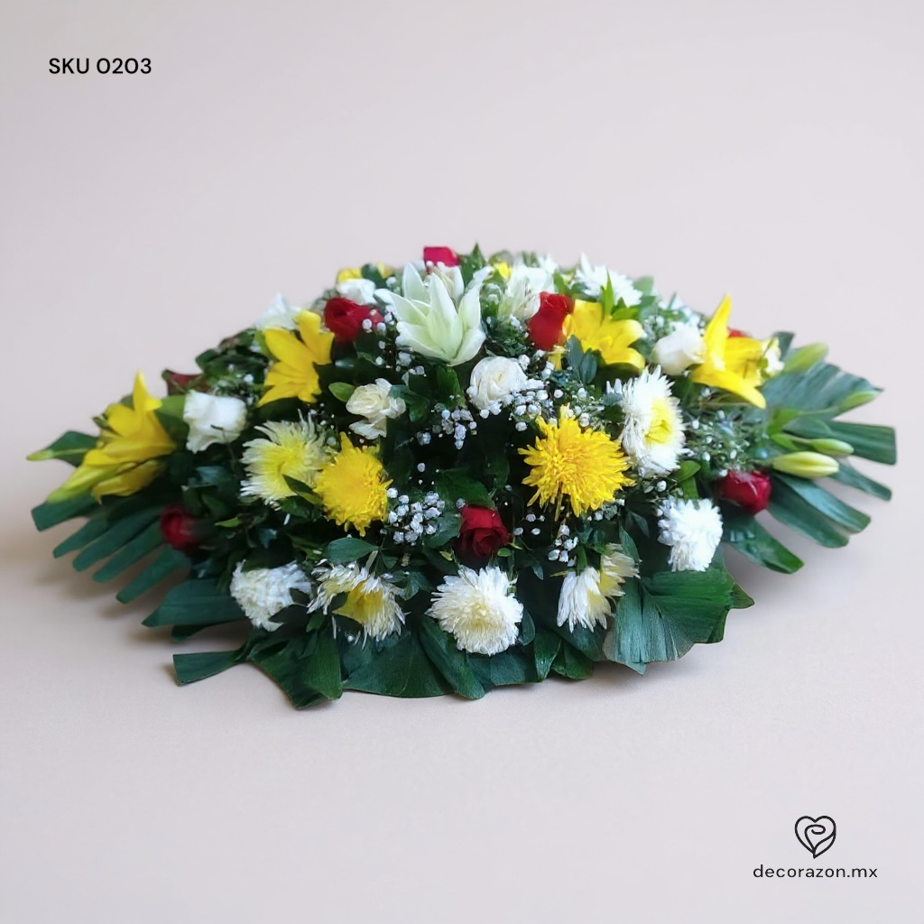 Ofrenda floral de combinación de flores en tono rojo,blanco y amarillo.
