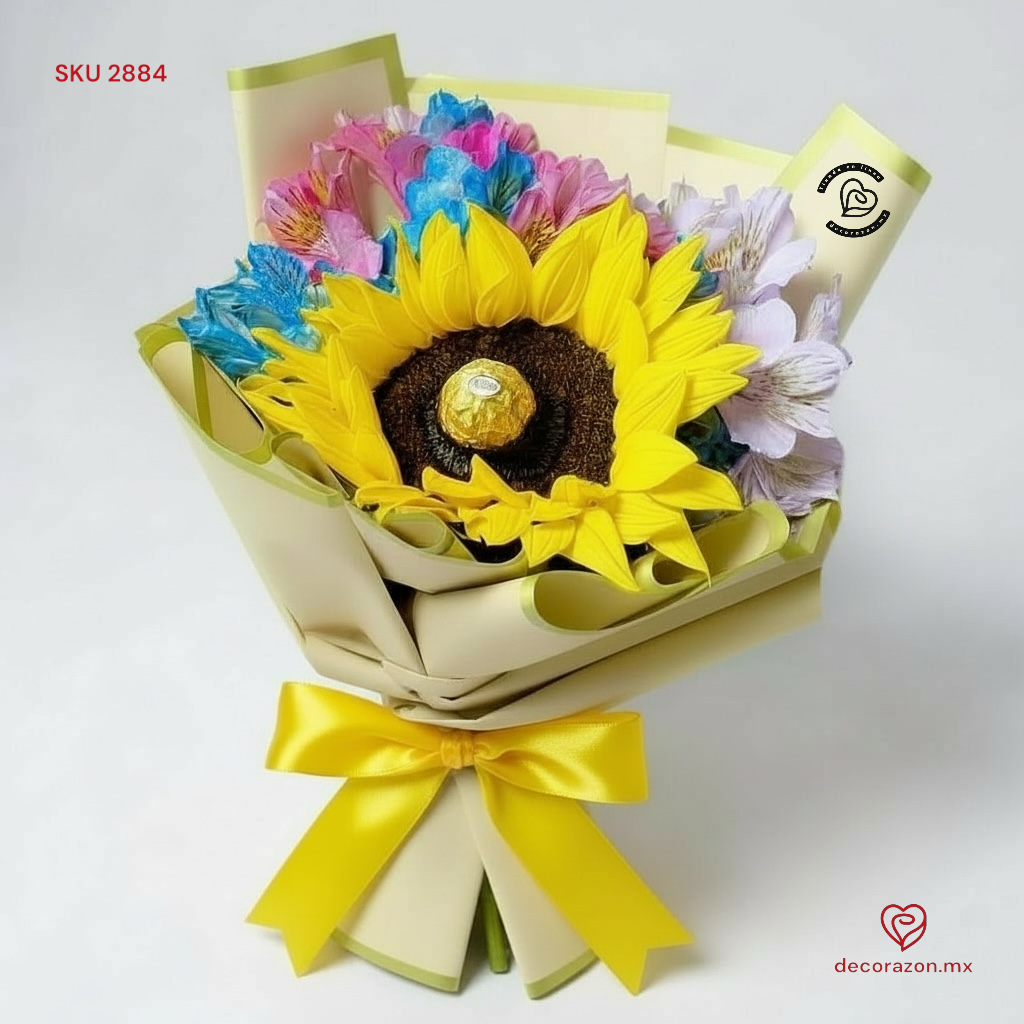 Nunca subestimes el poder de la sencillez.Llena de color y endulza su día con este ramo de girasol,astromelia de colores y un chocolate Ferrero Rocher. 🌻