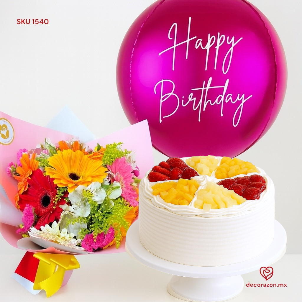 Celebra su cumple con un colorido globo,ramo y un delicioso pastel que sorprenderá a tus seres queridos. Asegura momentos inolvidables con este regalo inesperado. ¡Sorprende con una porción de alegría y dulzura en cualquier día especial!