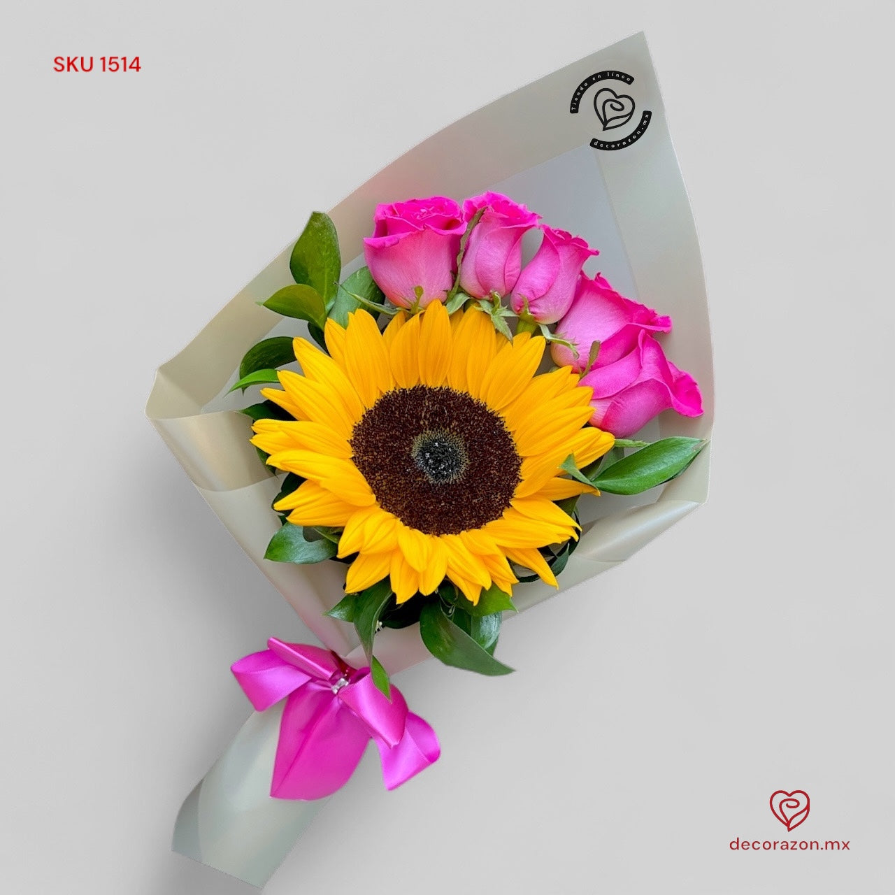 Este ramo de girasol y rosas fiusha es un regalo especial perfecto para expresar amor y alegría. Con una mezcla de tonos brillantes y vibrantes, este ramo traerá una sonrisa a cualquier persona. Ideal para cumpleaños, aniversarios o simplemente para demostrar amor y felicidad.