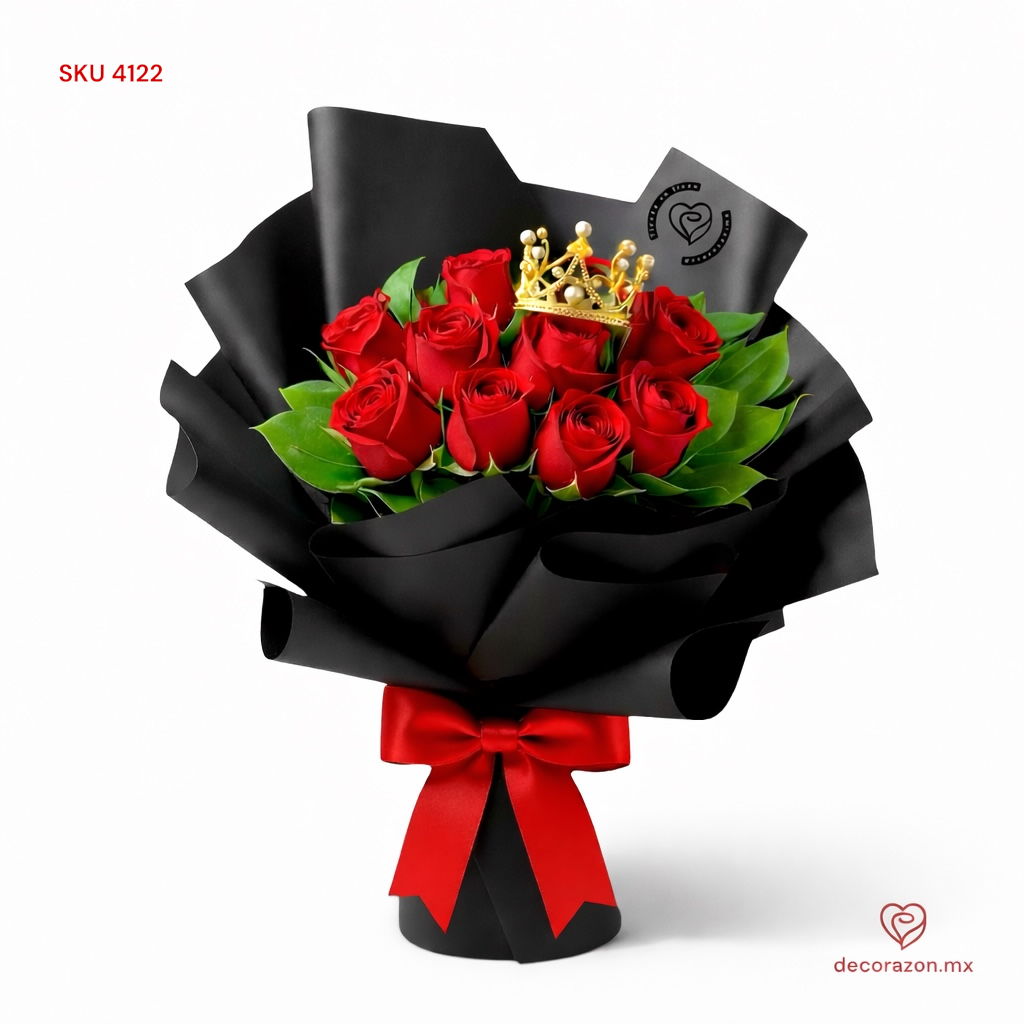 Este ramo de rosas rojas, adornado con una delicada coronita que evoca el amor eterno. Cada pétalo, una declaración de afecto, se convierte en el símbolo perfecto de tus sentimientos más profundos.