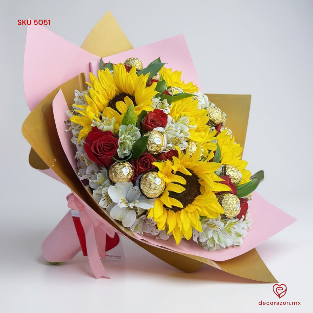 Este impresionante ramo combina la calidez y energía de los girasoles con la delicadeza de las rosas , creando un contraste perfecto entre fuerza y ternura. Acompañado de unos exquisitos chocolates Ferrero.