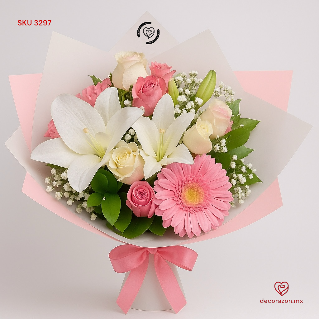Ramo de Flores en tiernos colores, combinado con Follajes finos y Envoltura de yute que completa la armonía de este bonito arreglo.