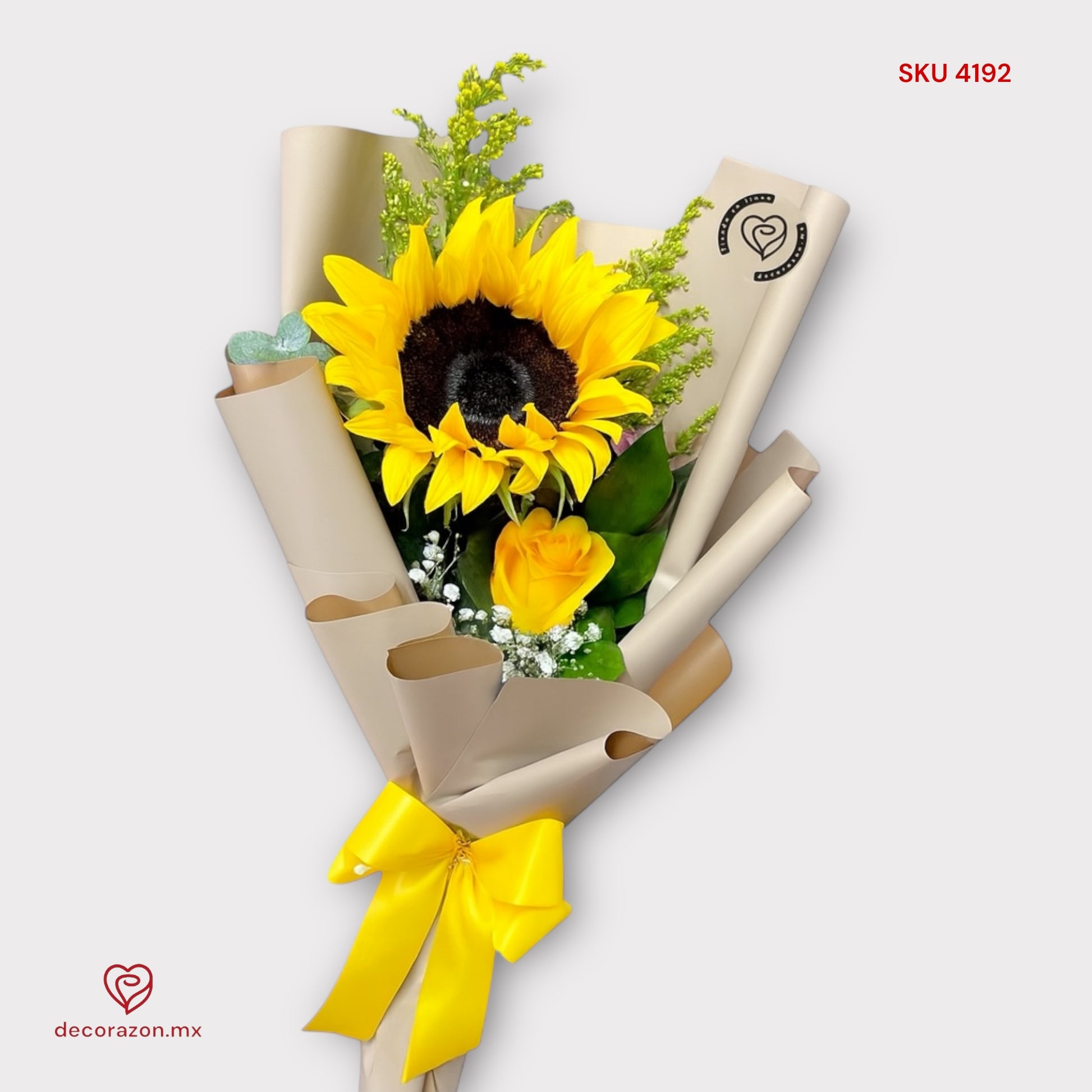 Este arreglo floral seguramente iluminará el día de esa persona especial. Disfrute del contraste entre la suavidad de las rosa y la energía del girasol, que representan la amistad y el amor incondicional.