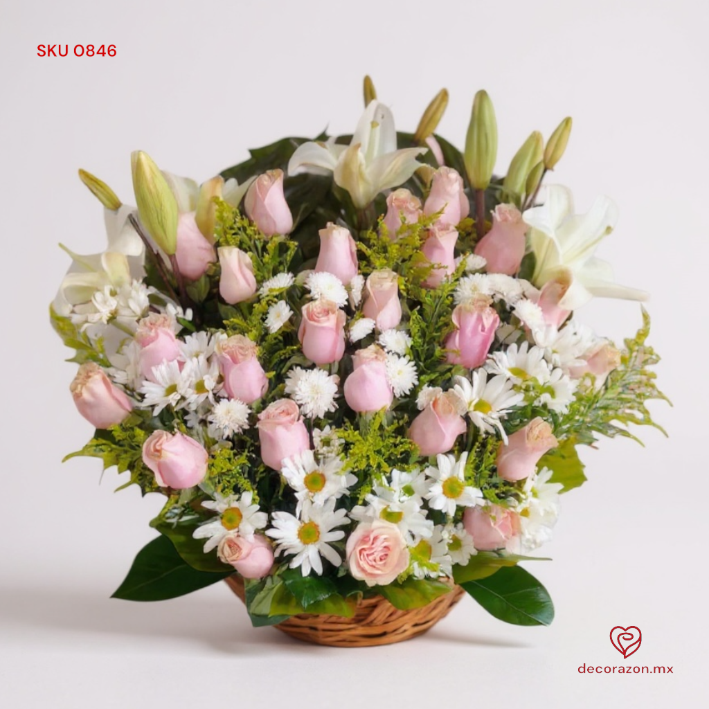 Canasta en tono rosa ideal para el cumpleaños de esa persona especial. Quedará encantada con tan bonita sorpresa.